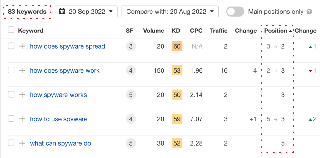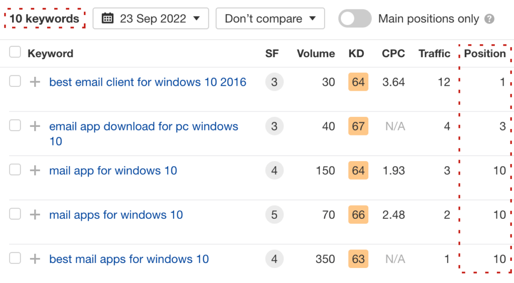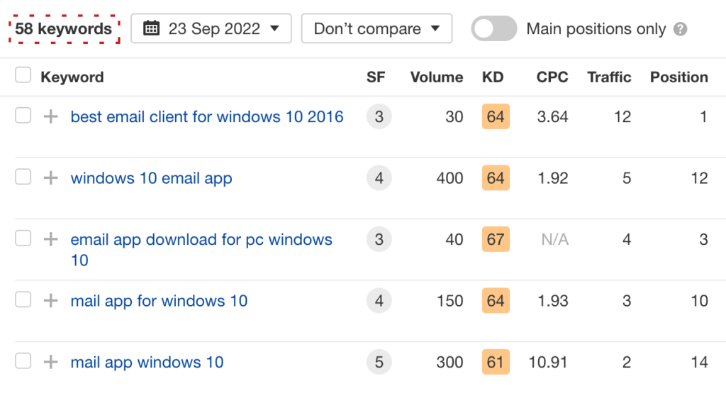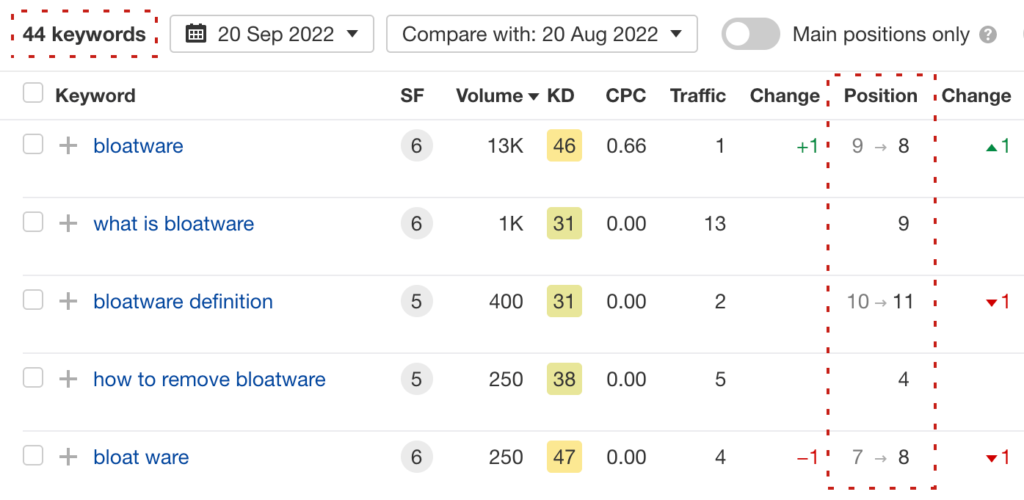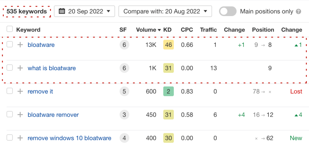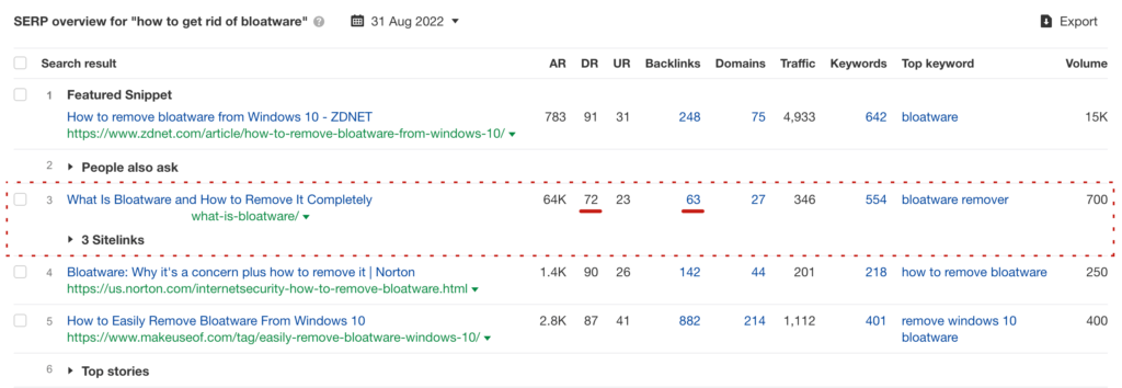 An article created by our team is not only ranking in the top three for the target keyword (“how to get rid of bloatware”) but is also gaining top-ten positions for more high-volume competitive keywords. For most of those keywords, competitor websites have a higher domain rating and a larger number of backlinks.