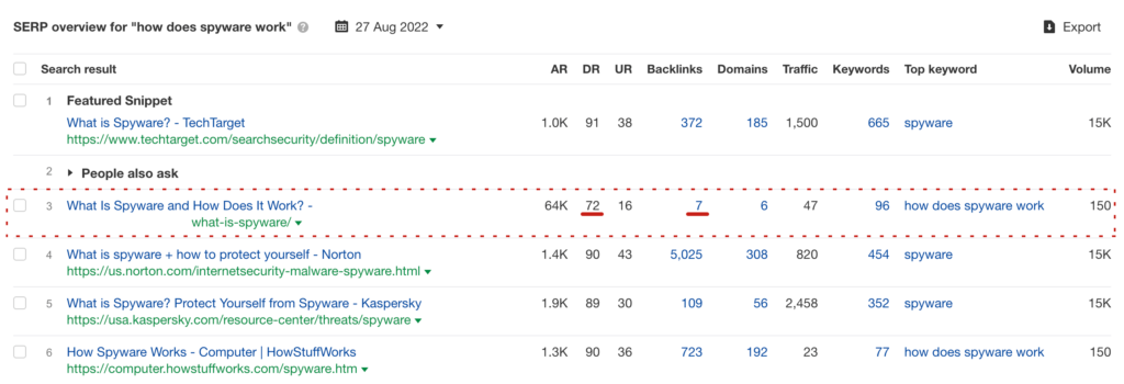 An article created by Content KIT helped our client outrank their competitors, despite their stronger domains (DR) and larger backlinking budgets (Backlinks). Among the domains left behind were such famous companies as Norton and Kaspersky Lab.